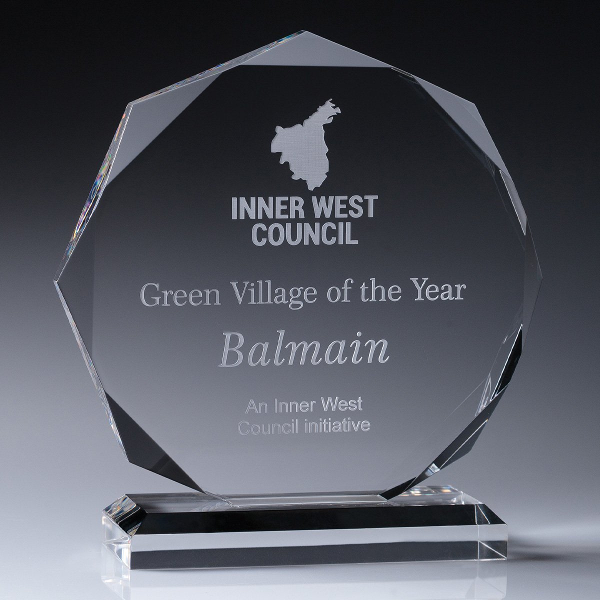 Prestige acrylic awards featuring distinct, facet edged octagon design. Acrylic allows for precise, stand-out engraving to ensure the awards are treasured by all recipients.