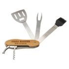 Brilliant engravable gift idea for that special someone who loves their BBQ. The beechwood & stainless steel set includes scrapper, brusher, fork & bottle opener. Presented in own carry bag.