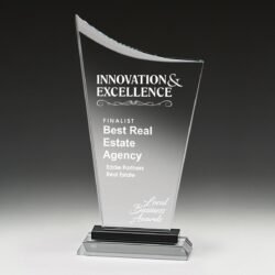 Different design of glass awards, the Aqua Glass features unique texturing, and a design elevated by the blue base element. The series is available in 3 impressive sizes, in a presentation gift box and the distinctive shape and design of these awards may complement your field of activity or industry.
