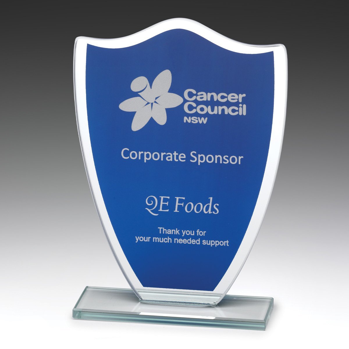Affordable glass award – supplied in gift box – in traditional shield shape with blue panel for your engraving requirements. Part of the range of budget glass awards for you to consider.