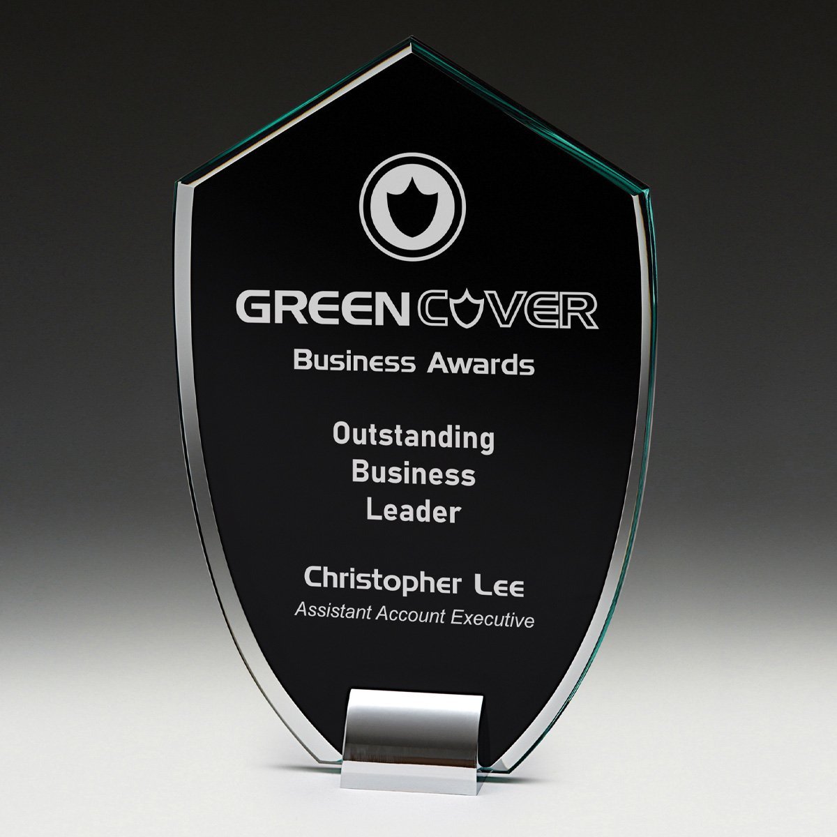 Outstanding glass awards with patented black panels allow for precise engraving to your requirements. Design is elevated by the shiny metal bases. In gift boxes.
