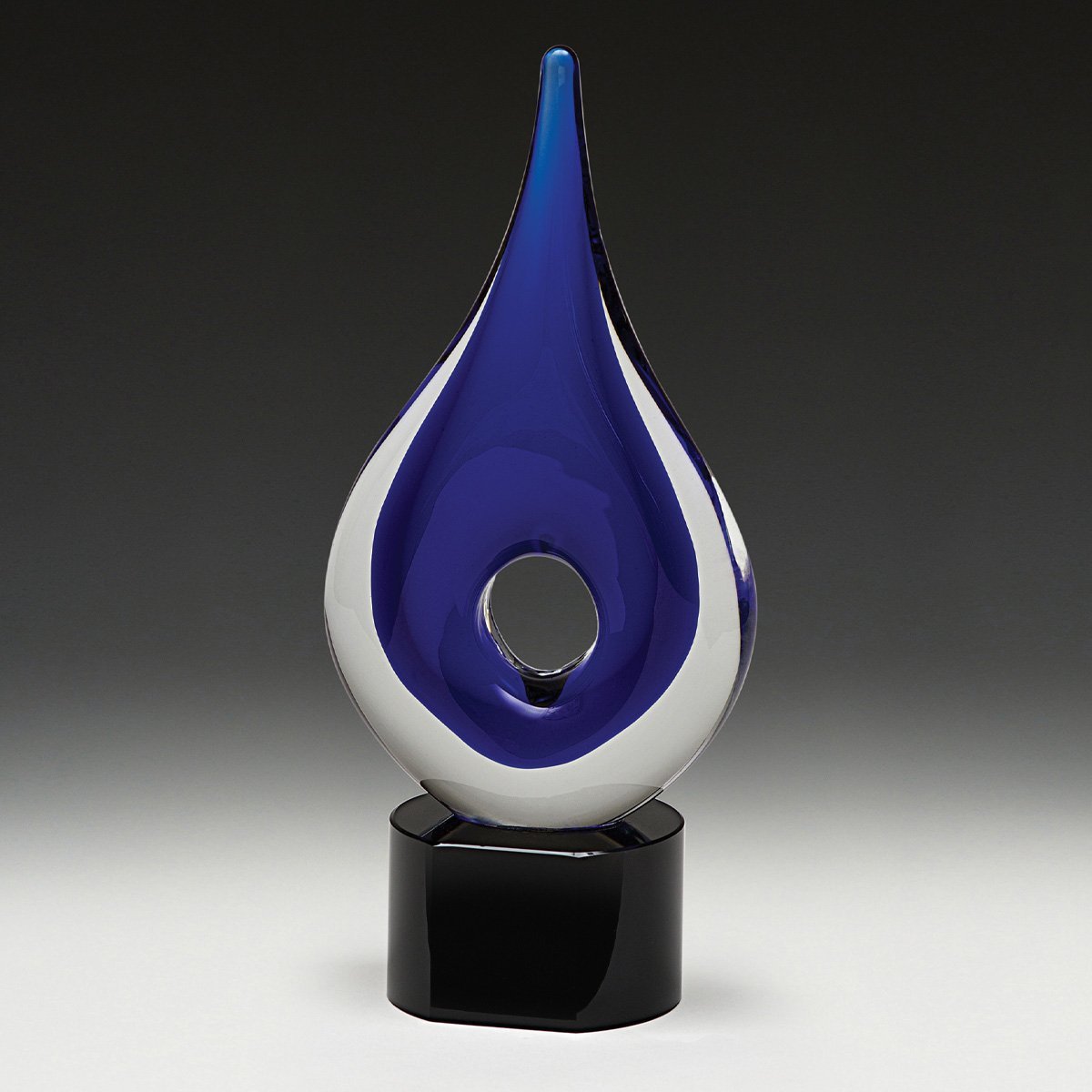 Majestic art glass award, the Plume features different hues of blue, gravity defying design and premium crystal base for your engraving.