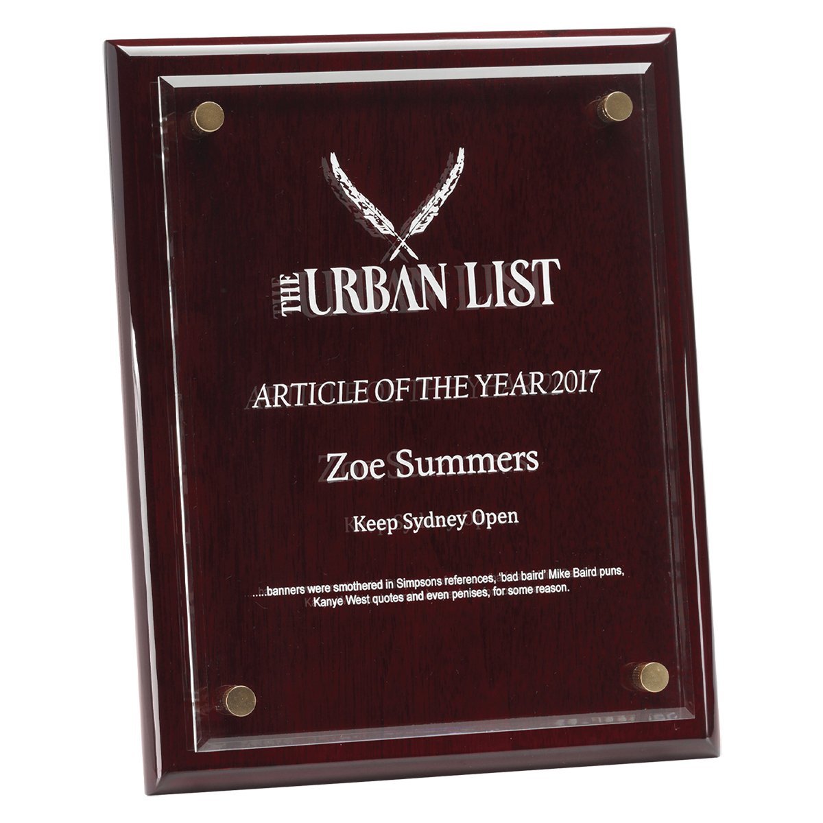 Brilliant awards of timber and acrylic offer a premium option to recognise the achievements of your award winner. Series available in 3 impressive sizes, considerable space is provided for your logo and text requirements. The rosewood timber plaques benefit from a wonderful polished effect – offset by floating acrylic to display your engraving. Double metal stands are supplied with each award for their ongoing presentation.